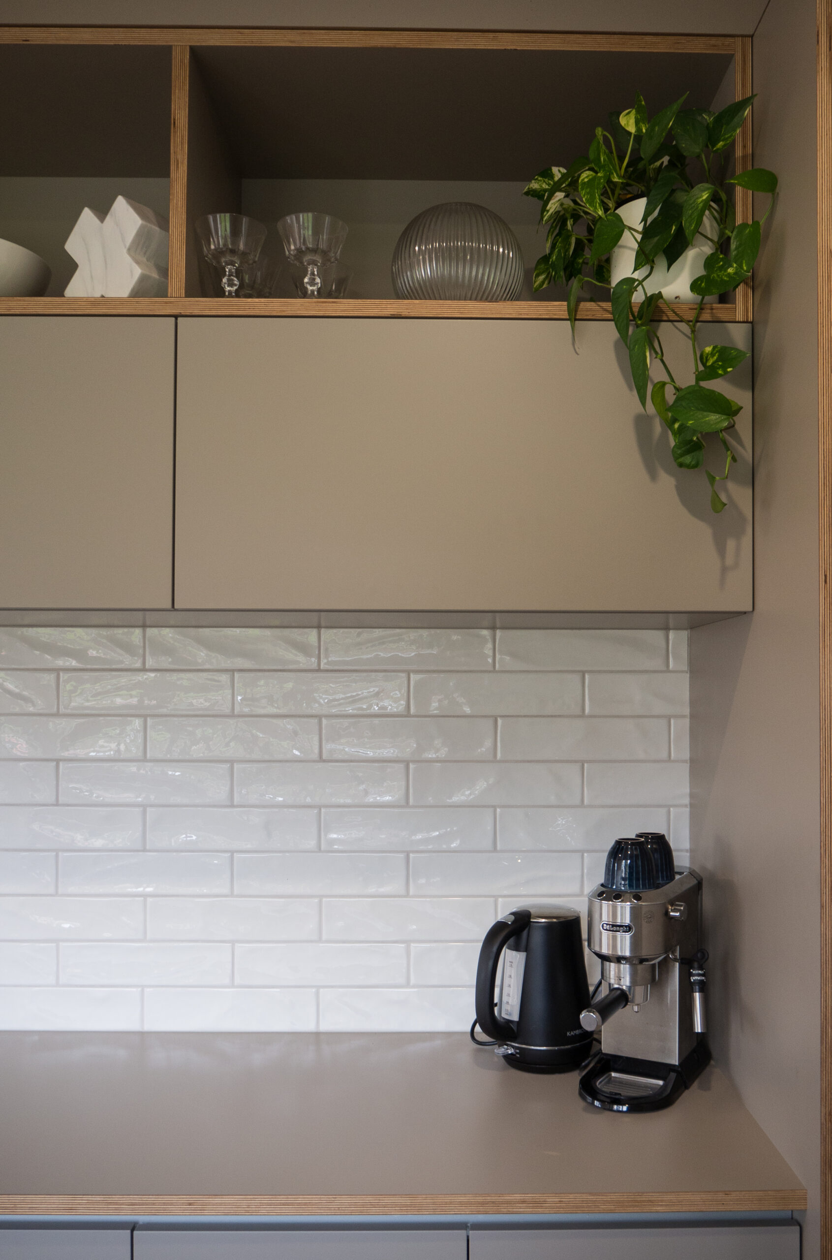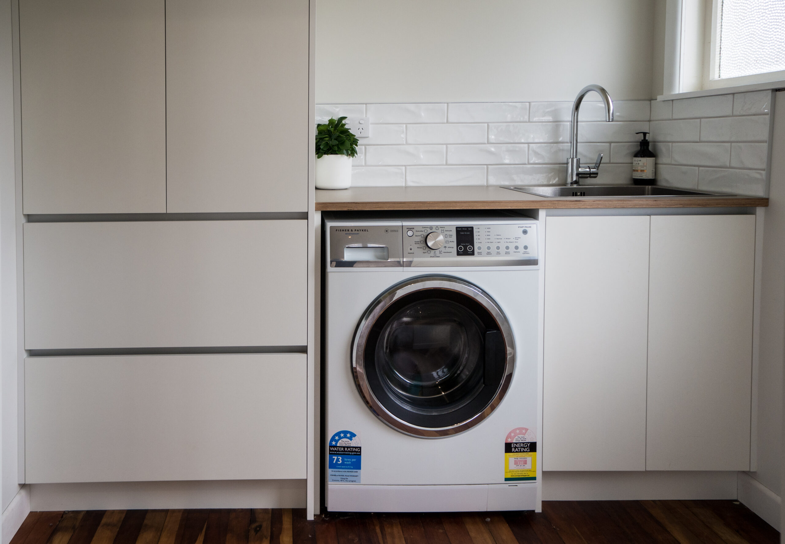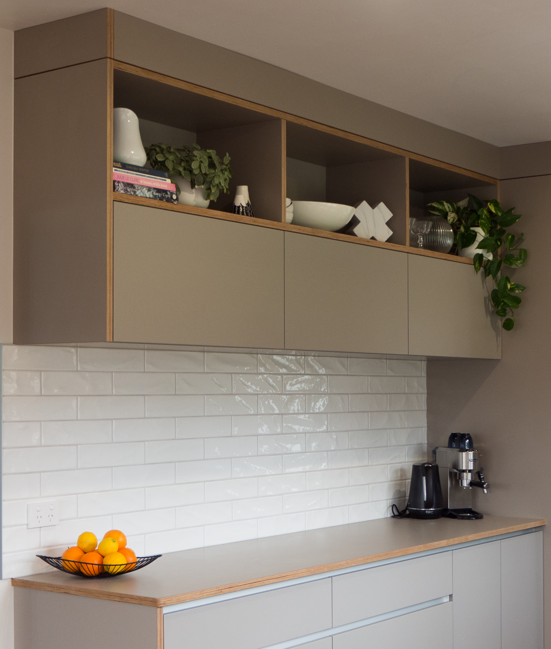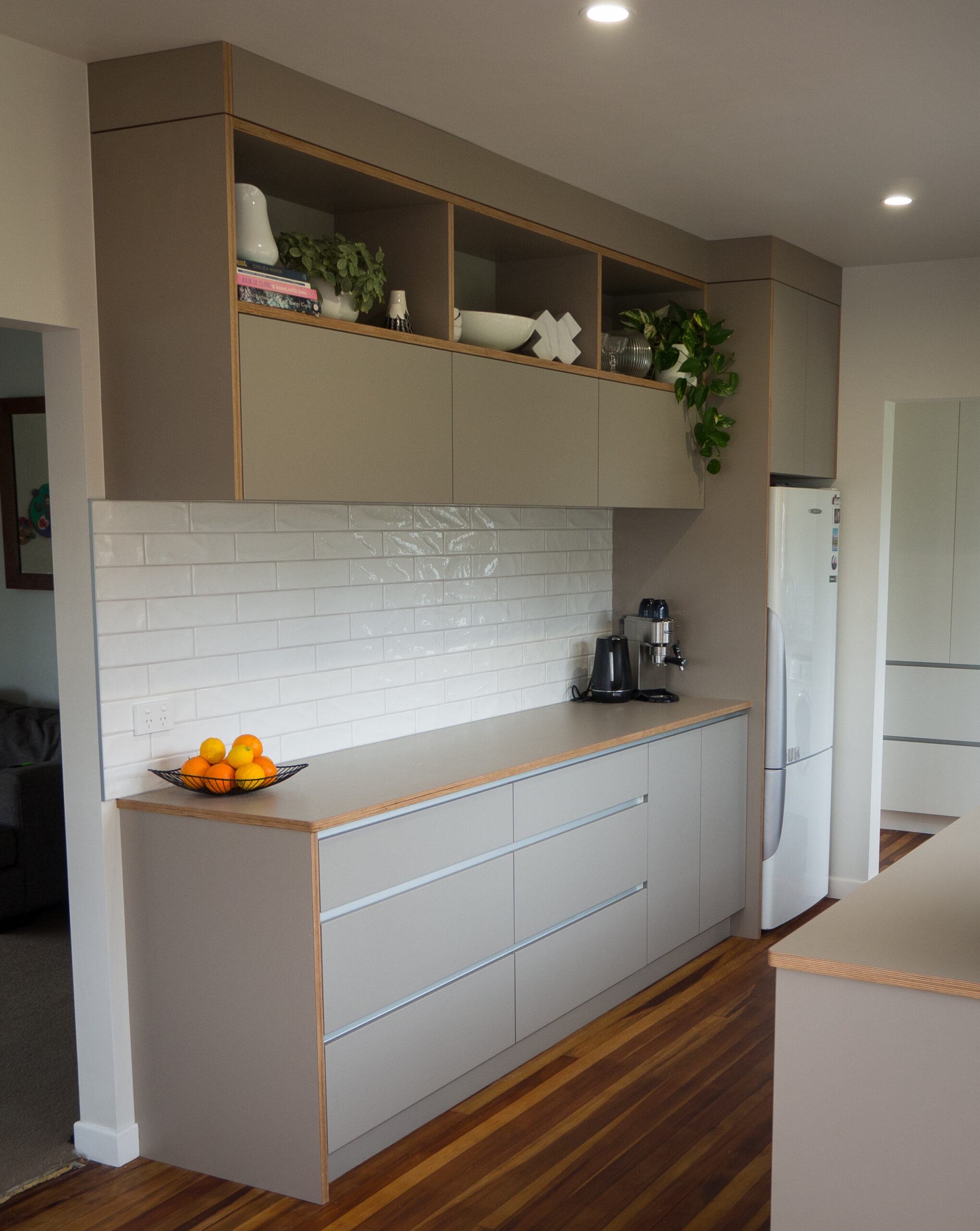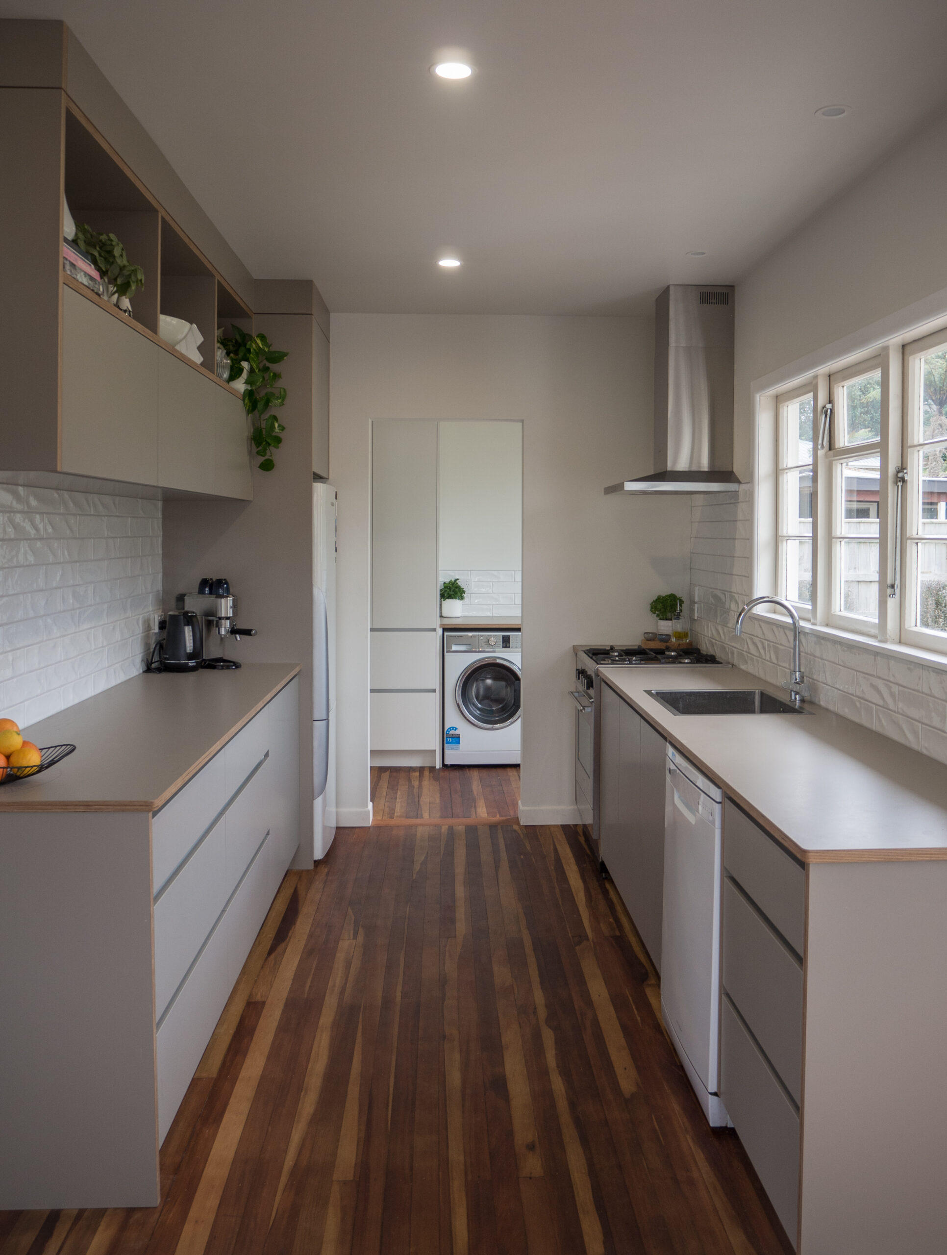 We loved working on this expertly styled Scandinavian inspired kitchen and laundry. The fronts, benchtops and end panels are all manufactured out of one of our favorite products, Futura Ply which is a hard-wearing laminate with an exposed ply edge, creating an architectural 'frame' around the cabinets. The client polished up the original hardwood floors which tie in with the ply edge and the results are phenomenal.